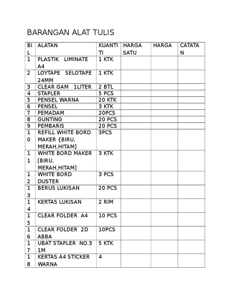 Semua bekalan pejabat adalah dengan harga. Senarai Alat Tulis Sekolah Bag bergantung kepad saiz buku anda Buku latihan ada baiknya beli yang tebal bekas pensel kotak pensel pencil case Pen Hitam Biru Merah sekolah rendah ada yang tidak perlukannya Pensel kayu 2B Pensel warna untuk pendidikan seni Pensel mekanikal lead pensel mekanikal ubat pensel nip. Senarai stok alat tulis pejabat bil perihal stok gambar stok alat tulis pdf jenis 1 kertas.